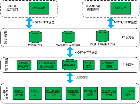 每個區都安裝有機械化生產裝置,通過通信節點實現嵌入式感知控制、無線自組網,由網關上的生產線作業管理平臺進行本地控制,由可視化WEB平臺或移動端APP應用為用戶提供加工環節動態界面。系統采用B/S架構,其架構如圖所示。
