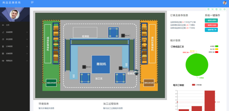 1、信息化管理系統:通過網關APP管理所有機械化設備,使用手機端或網頁端遠程下達工單,并可以實時獲取原料、成品庫存信息、生產結果統計展示(餅狀圖、柱狀圖)、工廠環境能耗數據監控。
