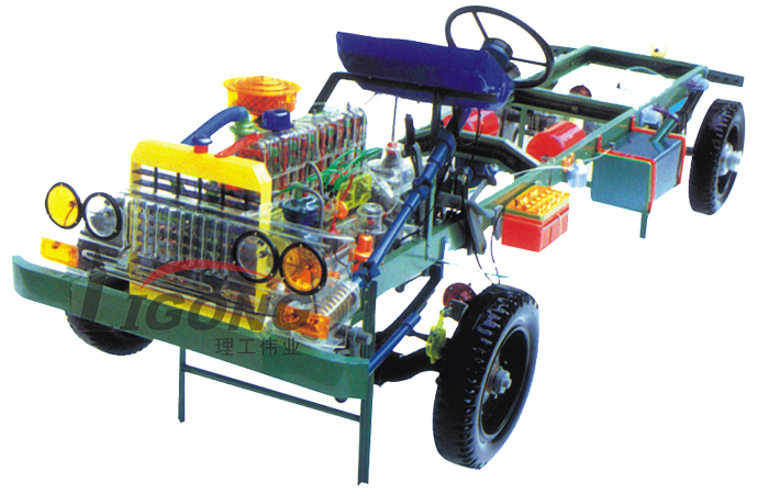 透明汽車整車模型選用透明有機玻璃制作,內中部件均以硬質塑料料加工,用 螺絲固定在金屬高溫烘漆而成的車架上。各總成部分都以壓模成形加 工,代替過去膠粘合的方法,使產品在強度上有很大提高。發動機總成用電機驅動,在油門處設有調速裝置,能演示發動機轉速高低。離合器分離明顯,操縱靈活,離合器外殼整體壓模而成,變速箱和各檔齒輪用各種顏色表示,換檔靈活,手制動美觀。后橋外形壓模而成,內中主減速、差速轉動自如,輪轂剎蹄壓模成型,剎蹄可調節,前橋輪鼓可調整,轉向裝置以及電瓶、油箱、水箱,制動管路分布清楚一目了然。電路采用對插件前后分布,燈架、風窗、儀表板、后燈架用透明有機玻璃壓模成整體美觀逼真。