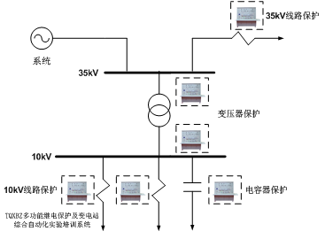 可完成變電站監控、35kV輸電線路、變壓器、10kV線路的運行和故障模擬、監測與保護、電容器投切運行及故障保護、電動機運行及故障保護、故障錄波、遙測、遙控、遙信等實驗、變電站電壓調節及變電站運行操作實訓、考核。