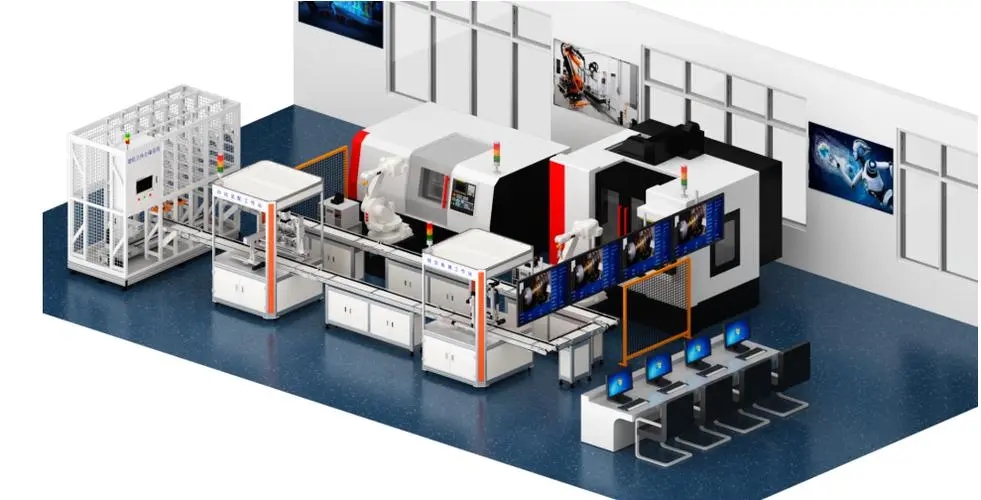 數控車床加工中心單元用于整個工件的軸類部份的加工,采用自動門、自動裝夾、四工位自動刀架、并有工件冷卻加工系統,現實機加工件無人化DNC自動加工,配置伺服電機、工業級數控系統。