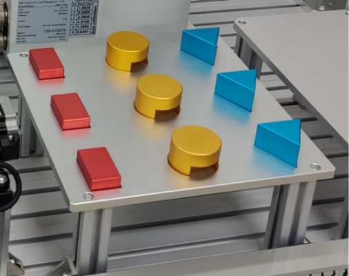 4、工業機器人末端安裝電磁吸盤,可匹配多種夾具。同時至少配備4種工裝夾具,夾具有專門的工具架安放,每個夾具的負重至少在3kg以上。按照實訓項目的要求可分別配合工業機器人完成物料夾取、軌跡模擬、寫字繪圖等工作。