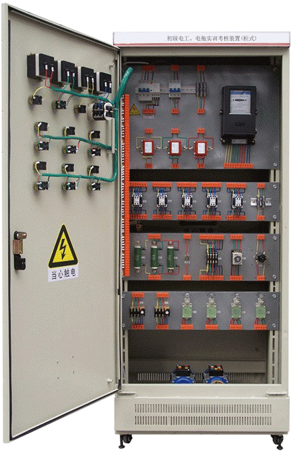 該裝置按標準電氣控制柜設計制造規格,充分利用雙面位置,柜內裝有完成各種照明電路所需的單相電度表、日光燈、單聯開關、插座、感應開關、漏電開關等,以及電氣控制所需要的多種低壓電器,如漏電斷路器、熔斷器、電流互感器、交流接觸器、時間繼電器、熱繼電器、中間繼電器、行程開關、按鈕、信號燈、轉換開關、電壓表、電流表、功率表及電度表等,為了延長電器使用壽命,各電器的接點都與接線端子相連,再由接線端子與被控制電氣連接。