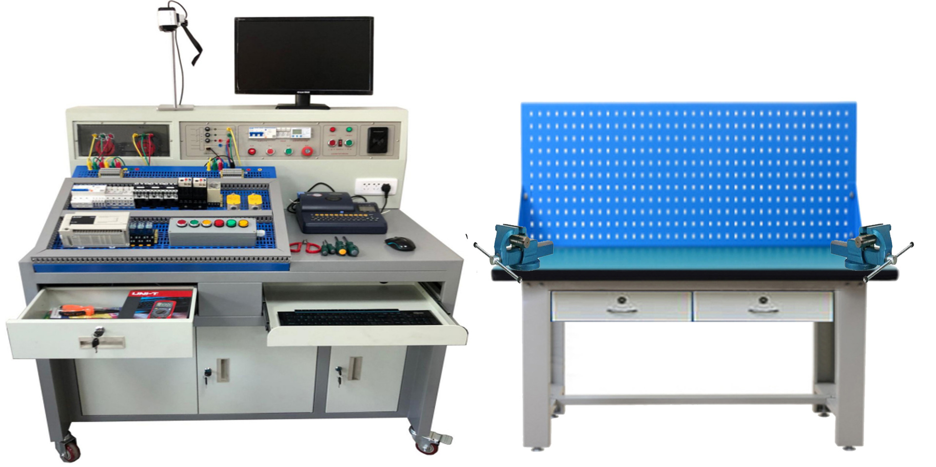 (1)本設備由實訓屏(內置電源)、實訓桌、儲物柜三大部分組成。以30mm×30mm成型方鋼作為設備主要框架材料;實訓屏、地盤采用焊接連接、關鍵部位采用三角筋用內六角螺釘加固連接,表面經高溫噴塑處理,美觀大方且有效起到防銹絕緣的作用;由兩條35mm×35mm鋁合金型材及滑槽組成網孔板固定機構;固定機構的下方是鐵制雙工位電源箱,每工位電源箱的布局依次為電源保護裝置、電源指示裝置、電源輸出;實訓桌桌面采用雙層亞光密紋結構,表面經過噴塑處理,提高防銹、絕緣性能;實驗桌底部裝有至少4個導向輪,方便設備移動。