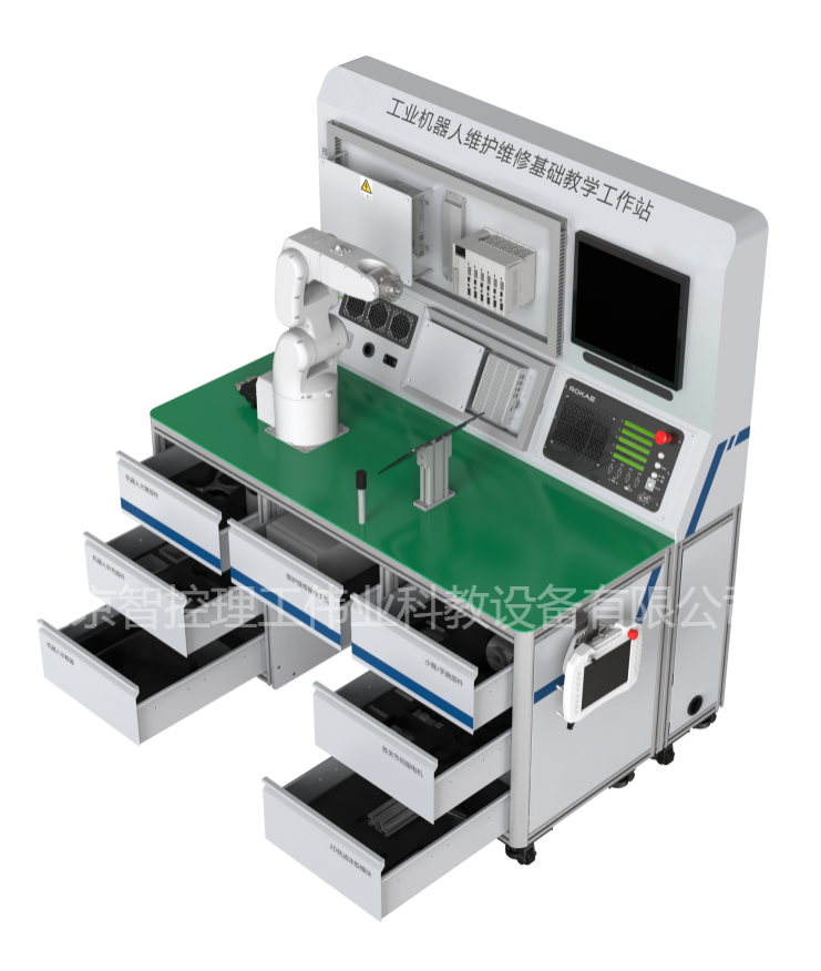 工業機器人維護維修基礎教學工作站,以工業機器人本體及其控制系統最常見維護維修操作為核心,通過對典型故障的診斷和排除,按照規范步驟完成對工業機器人本體的拆裝過程,并根據圖紙要求搭建控制系統并接線,由零件級深入了解工業機器人的構成形式和運動方式,掌握基礎維護維修技能。工作站配套了與生產廠家完全相同的工裝、工具,讓學生可以在教學環境中充分體驗高精度機電設備的生產工藝要求,確實掌握維護維修技能。