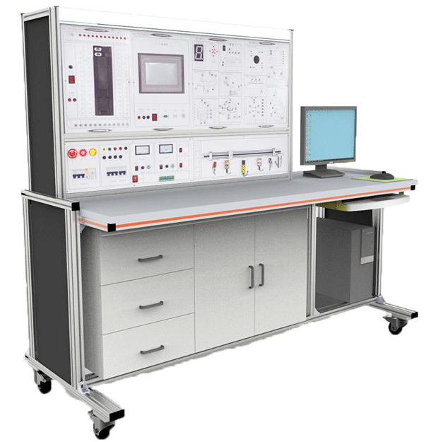 2、臺(tái)架構(gòu)成:實(shí)訓(xùn)臺(tái)采用工業(yè)鋁型材加工。桌面下面放置儲(chǔ)物柜,左側(cè)有3層抽屜,用于存放工具以及實(shí)訓(xùn)資料,右側(cè)為雙拉門(mén)式設(shè)計(jì),可以放置實(shí)訓(xùn)掛箱。底部裝有四個(gè)帶鎖止功能的萬(wàn)向輪。柜體后下側(cè)留有電源輸入線。預(yù)留計(jì)算機(jī)放置位置。