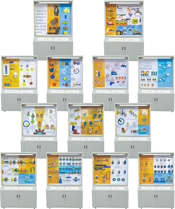 CLG-106型《機械基礎設計》示教陳列柜是根據教育部高職高專規劃教材設計的電化教學設備。本陳列柜共分十三個柜和一個電腦控制臺,并配有一臺功率放大器,VCD機和激光片,聲控同步演示,采用單獨驅動由電子設備控制演示,可由VCD控制順序自動運行講解;又能根據教材,教學需要而遙控任意選擇進行單獨演示。模型材料采用進口有機板和硬聚氯;板面附有必要的圖表和文字說明,演示形象逼真,運行可靠,制作工藝美觀,使用本陳列柜可提高教學效果,節約學時,是一套現代機化械課程教學應用實驗設備。