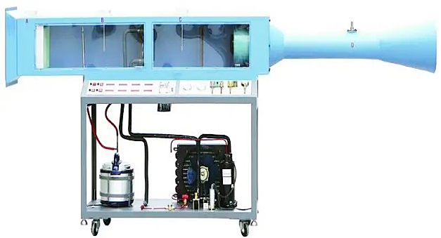 LG-LKR03型 空氣調節系統模擬實驗臺為直流式空氣處理系統,自制冷壓縮機、風冷冷凝器、蒸發器、風機加濕器、一次電加熱器和風管等組成。裝置整體固定在支架上,裝有腳輪,移動方便,具有冷卻、加熱、加濕干燥的作用,過程的空氣參數均可測量。可以使學生熟悉集中式空調系統中,直流式系統的空氣處理過程,并得到熱工測量和計算的基本訓練。