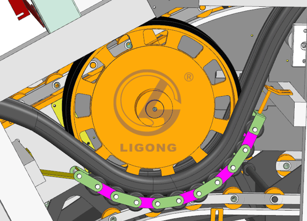 由扶手齒輪、扶手摩擦輪、張緊輪、托輥輪、壓輥輪、托帶鏈、回轉鏈行扶手導軌組成扶手帶動力系統。