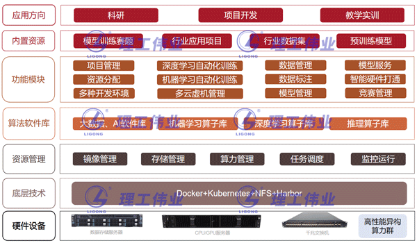 人工智能底層支撐平臺為一套人工智能底層資源管理系統,面向深度學習計算集群,需具備科研教學一體化,容器化架構。支持CPU/GPU異構計算分布式集群,科研數據管理服務,代碼和項目文檔管理服務,鏡像管理以及可視化展示等特點。可以支持多種深度學習框架,能夠快速部署深度學習開發、訓練、預測環境,全面管理深度學習任務,為深度學習用戶提供高效易用的平臺。對計算集群的CPU及GPU資源進行統一的管理、調度及監控,有效的提高計算資源的利用率和生產率為深度學習用戶提供高效易用的平臺。