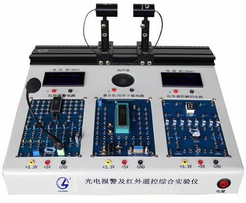 我司自主研發的LG-CDJ01型光電報警及紅外遙控實驗儀具有兩大功能,一是光電報警系統,通過感光器件(紅外接收管)把光信號轉換成電信號,控制數碼管的顯示以及報警電路,利用部分數字邏輯電路及單片機,實現在報警過程中顯示對應路數的功能。二是紅外遙控系統(遠程控制技術又稱為遙控技術,是指實現對被控目標的遙遠控制,在工業控制、航空航天、家電領域應用廣泛。紅外遙控是一種無線、非接觸控制技術,具有抗干擾能力強,信息傳輸可靠,功耗低,成本低,易實現等顯著優點,被諸多電子設備特別是家用電器廣泛采用,并越來越多的應用到計算機中),該系統通過對紅外遙控器的解碼實現各種控制電路,如數碼管顯示控制、發光二極管發光控制、蜂鳴器開關控制等。本款儀器的設計采用可搭建電路組件的結構,從設計、安裝、搭建、調試等方面入手,全面提高學生的動手動腦能力和技術水平。